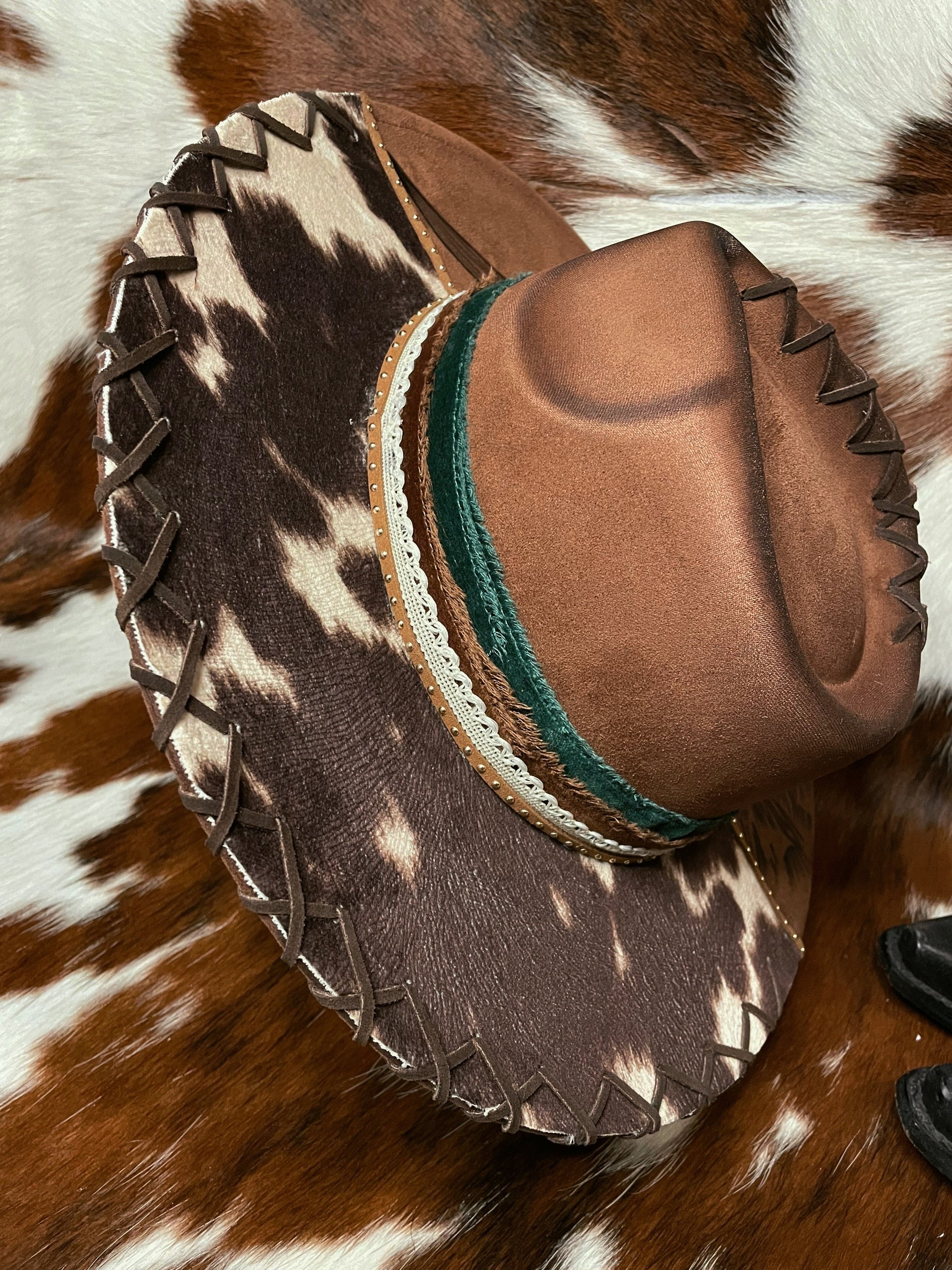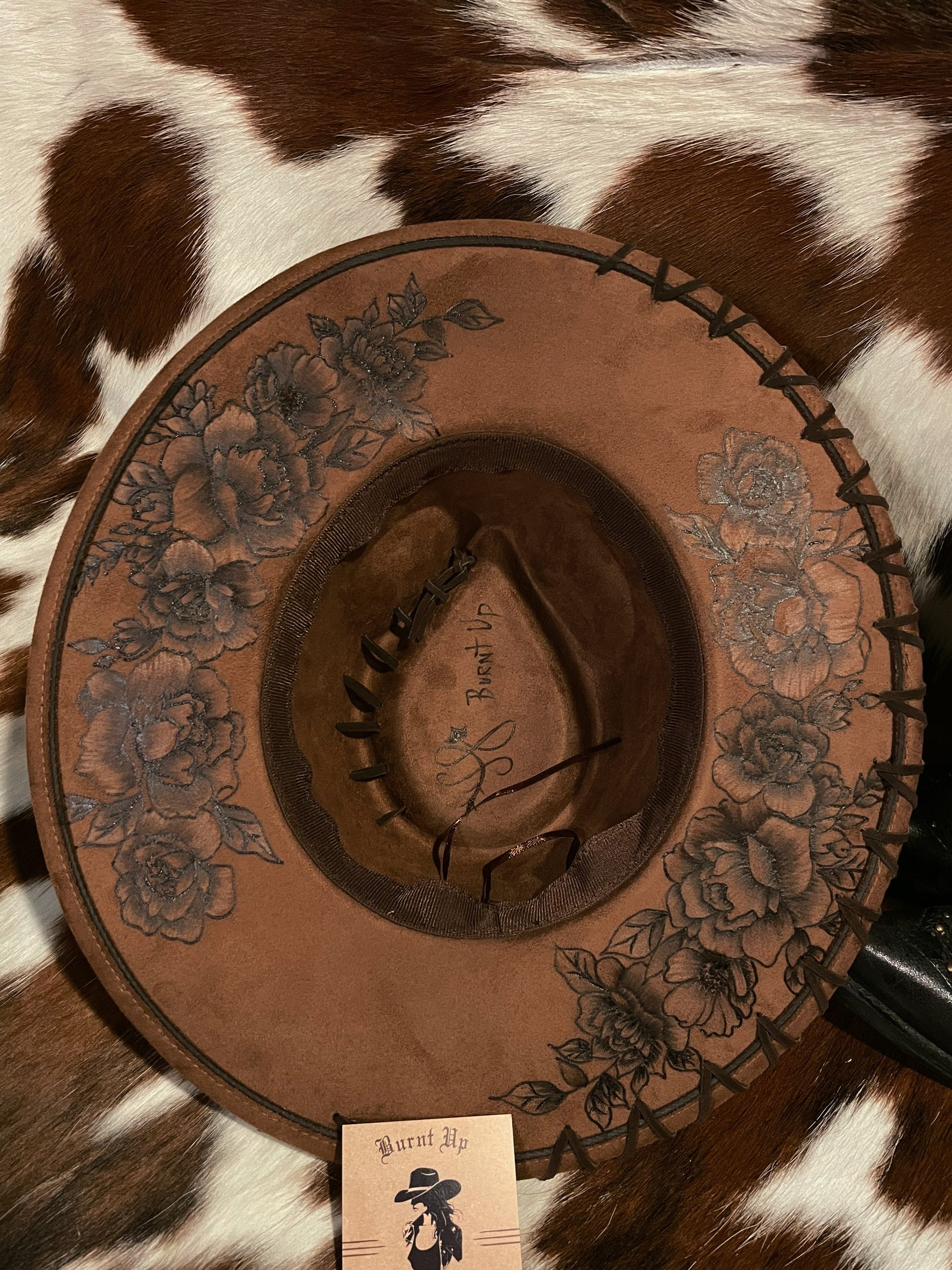Artwork is burned entirely by hand. All hats are one size and come with an adjustable cinch on the inside to adjust smaller. 23”-21”.