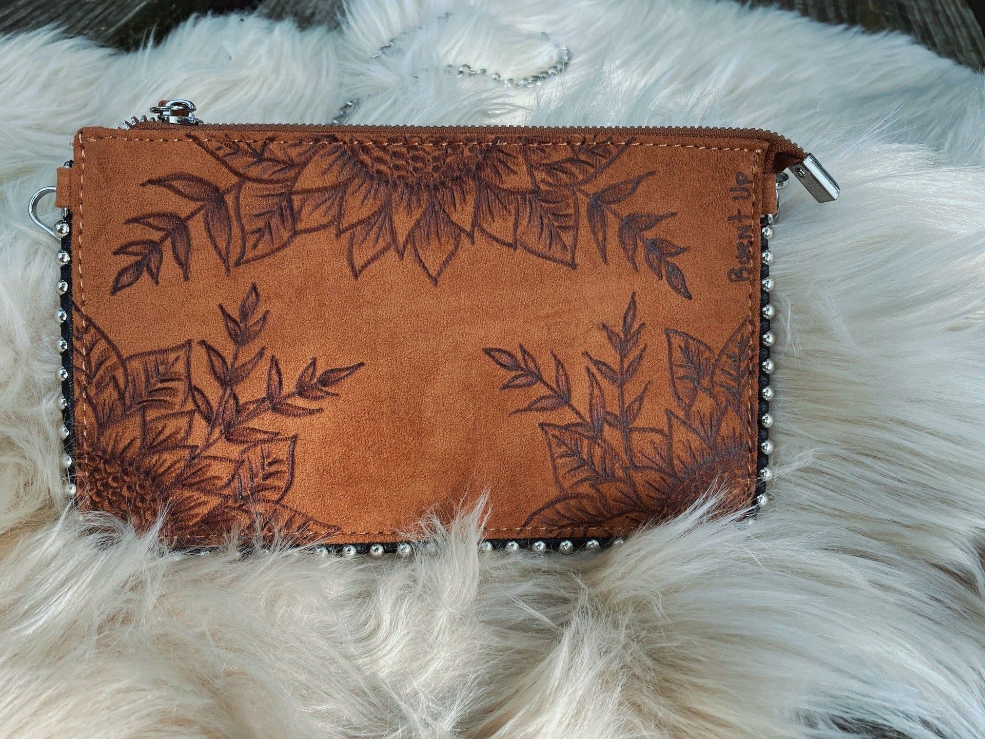 Hand burned clutch purses are perfect to complete any outfit with one of my burned hats! Big enough to hold essentials and small enough to bring with you anywhere you go! Front and back photos.