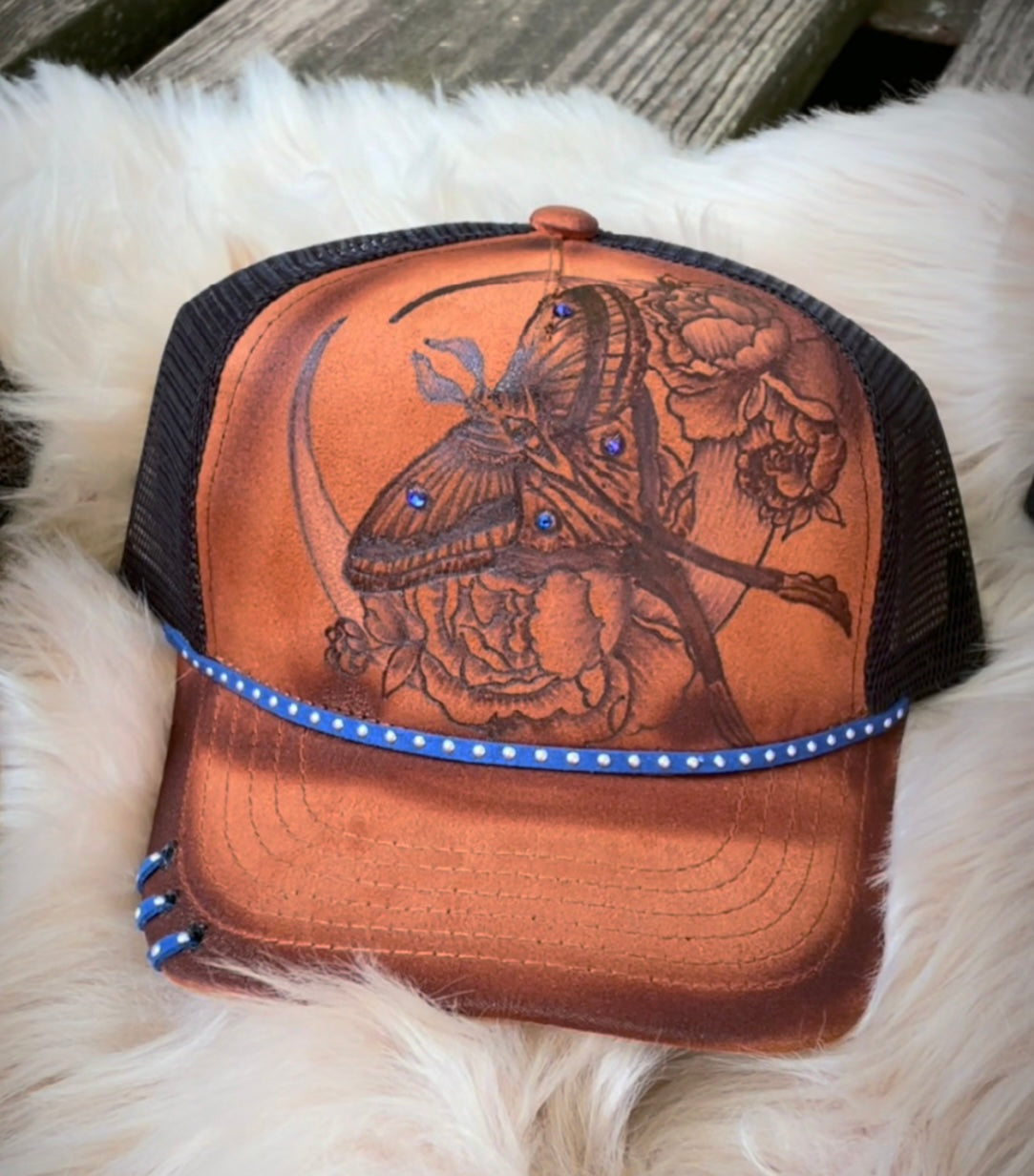 Artwork is burned entirely by hand. Has blue rhinestones. Mesh SnapBack