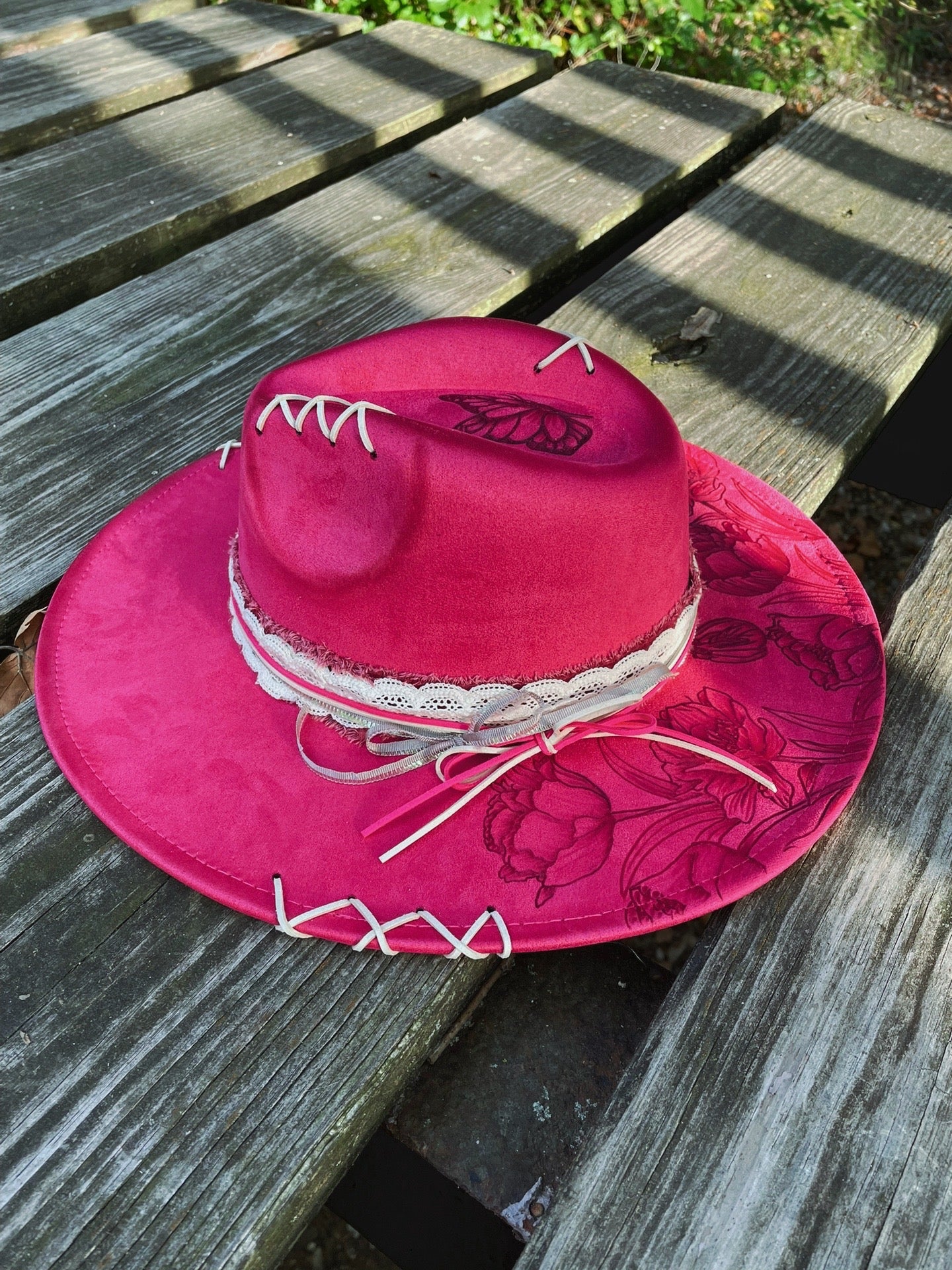 Artwork is burned entirely by hand. All hats are one size and come with an adjustable cinch on the inside to adjust smaller. 23”-21”.
