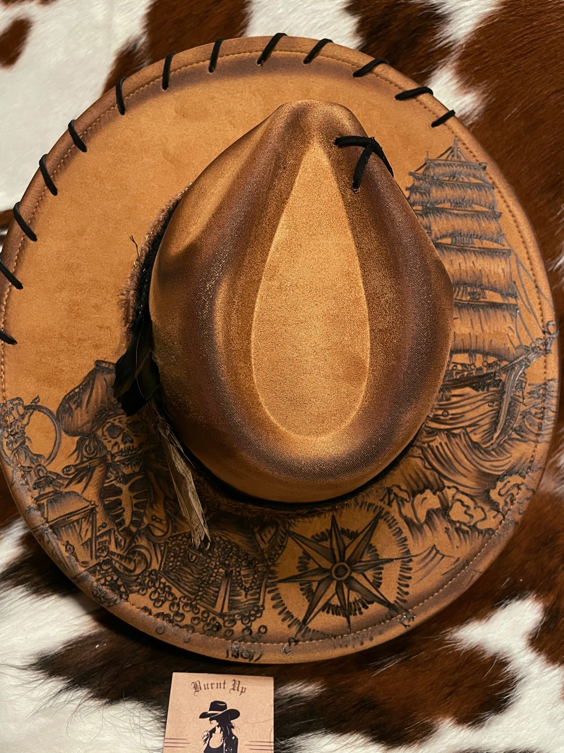 Artwork is burned entirely by hand. All hats are one size and come with an adjustable cinch on the inside to adjust smaller. 23”-21”.