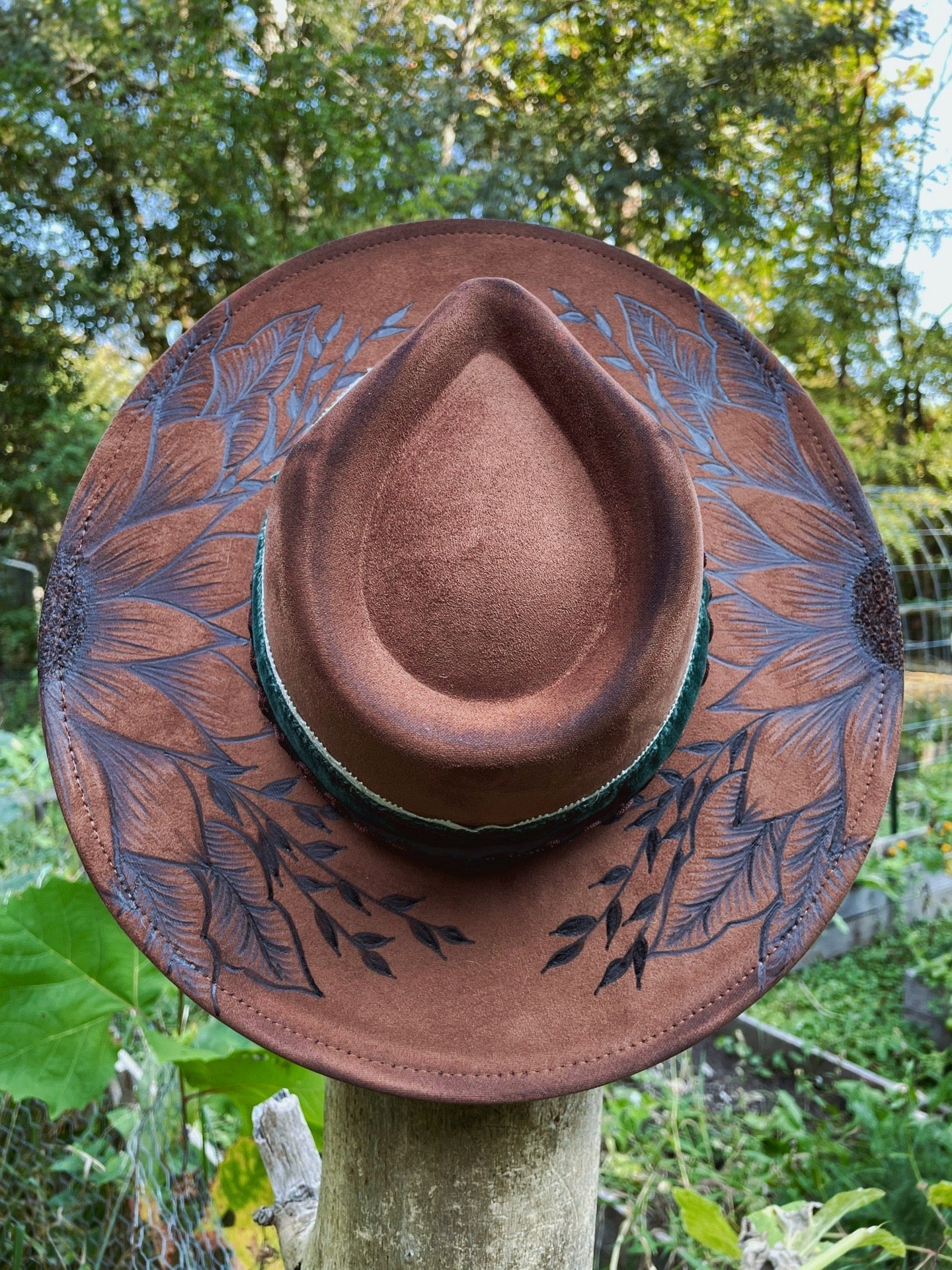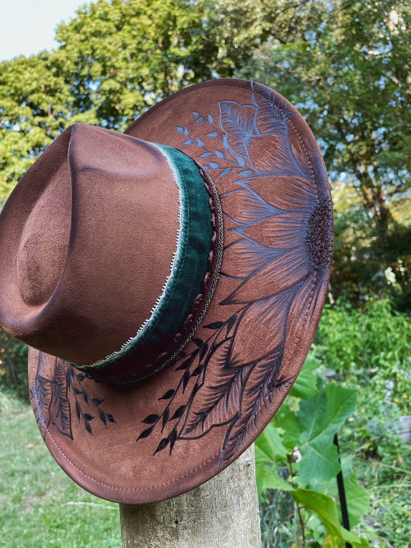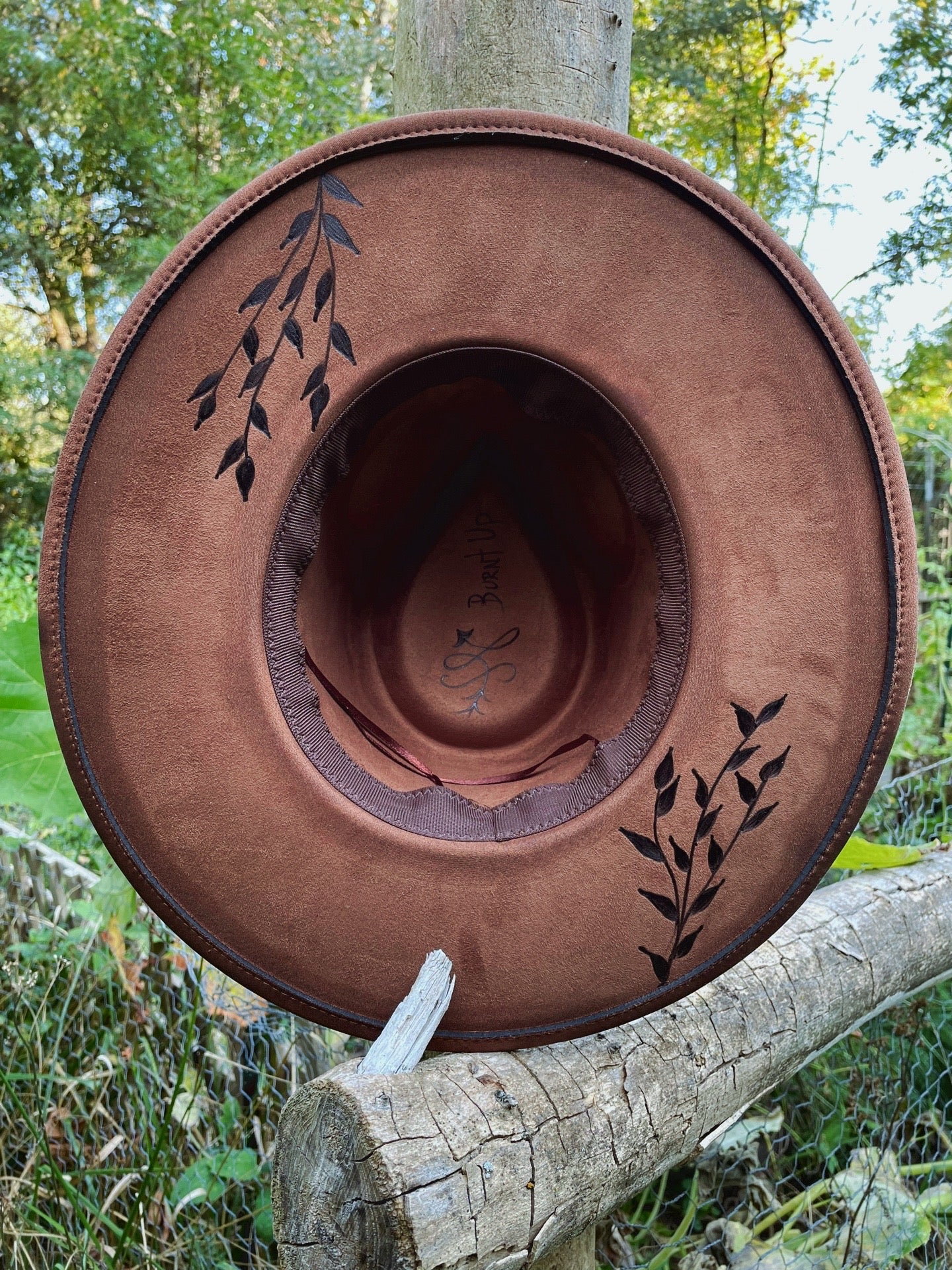 Artwork is burned entirely by hand. All hats are one size and come with an adjustable cinch on the inside to adjust smaller. 23”-21”.