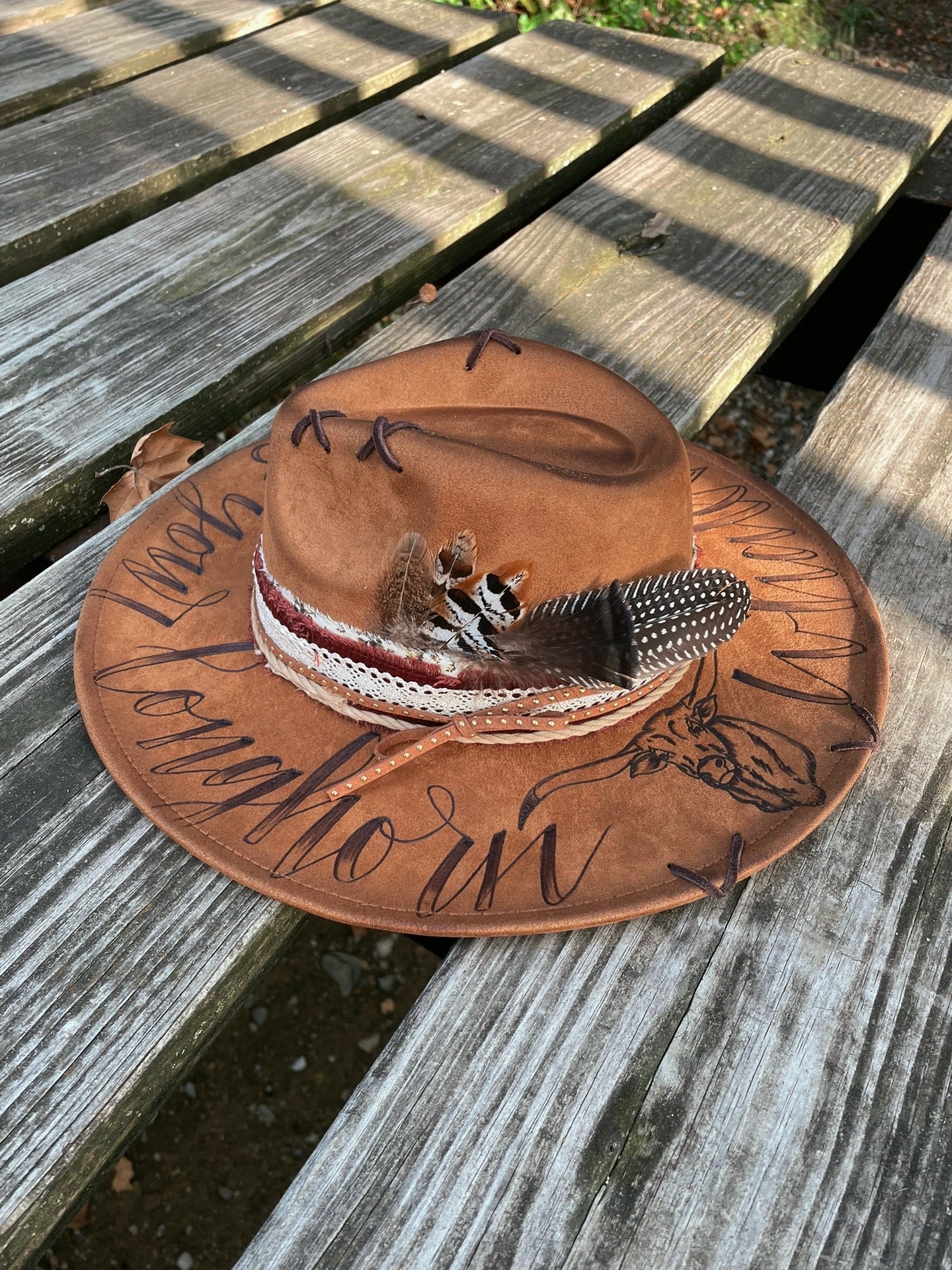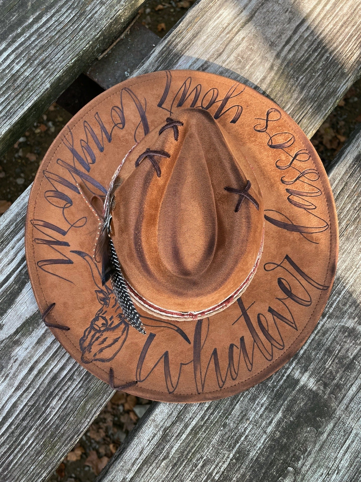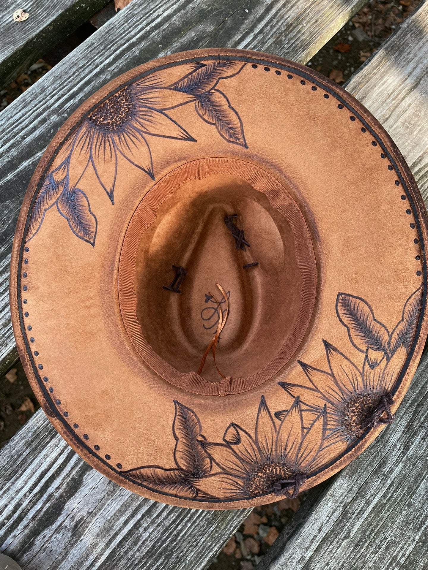Artwork is burned entirely by hand. All hats are one size and come with an adjustable cinch on the inside to adjust smaller. 23”-21”.