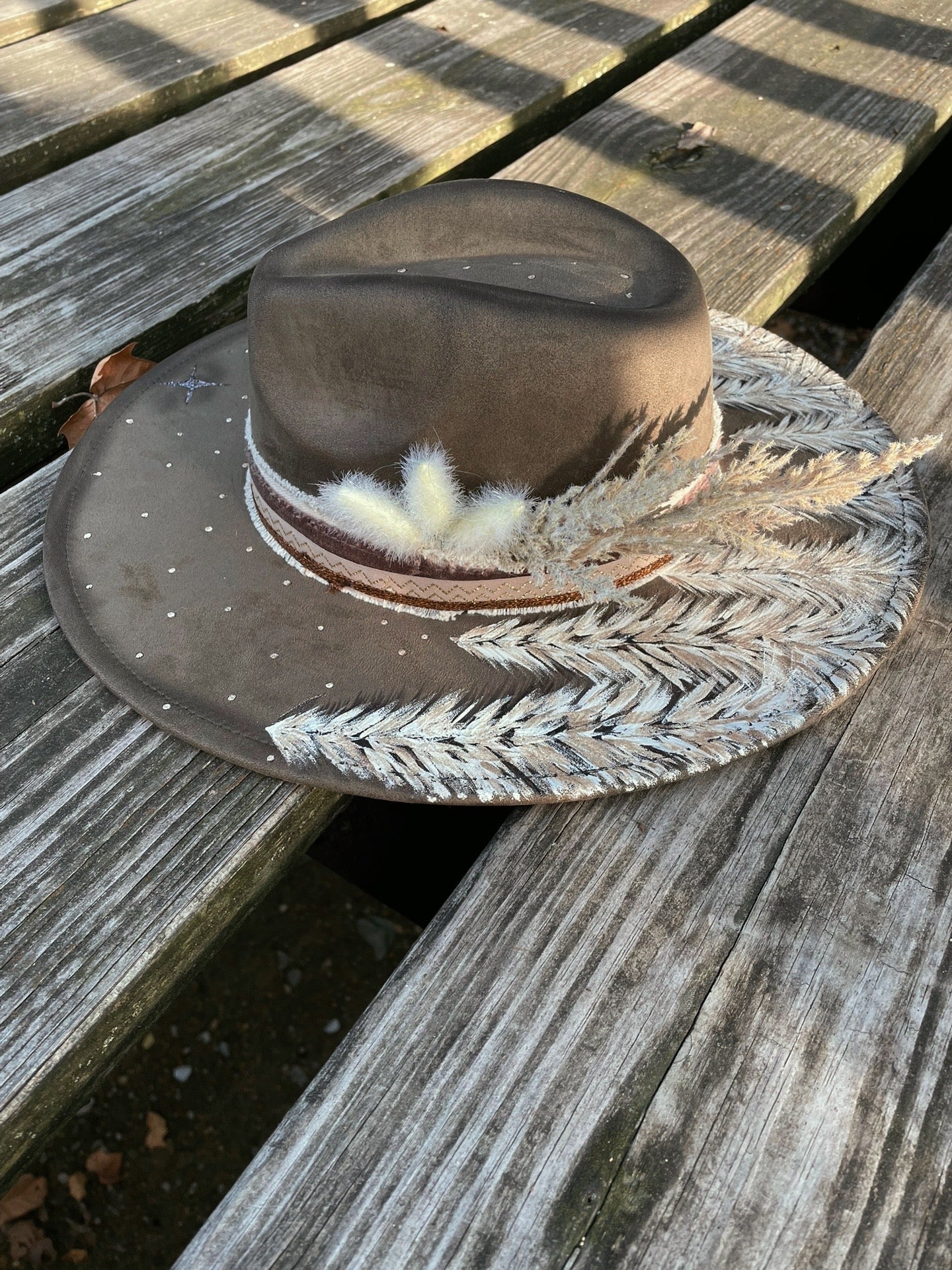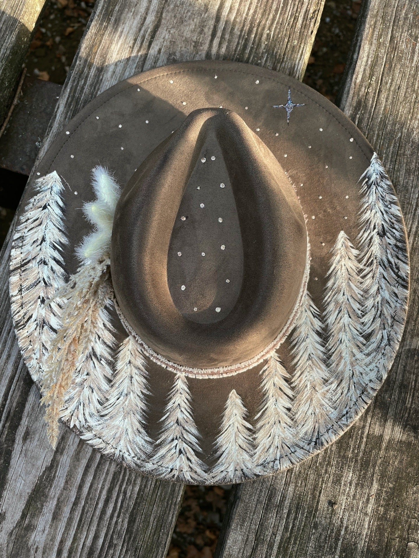 Artwork is burned entirely by hand. Painted and has glitter paint. All hats are one size and come with an adjustable cinch on the inside to adjust smaller. 23”-21”.